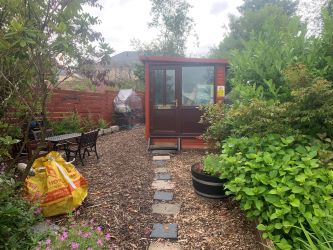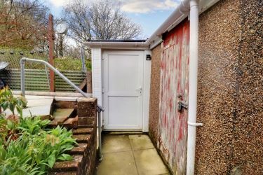 Outside: Steps leading to property with path leading to rear garden that has been made with easy maintenance and benefits from storage shed.