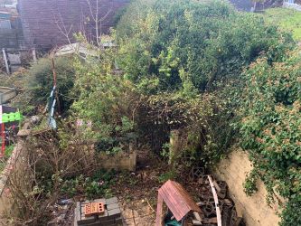 Outside: Rear garden (overgrown) with side access, two sheds, long strip of garden to the side, gated off road parking to the front