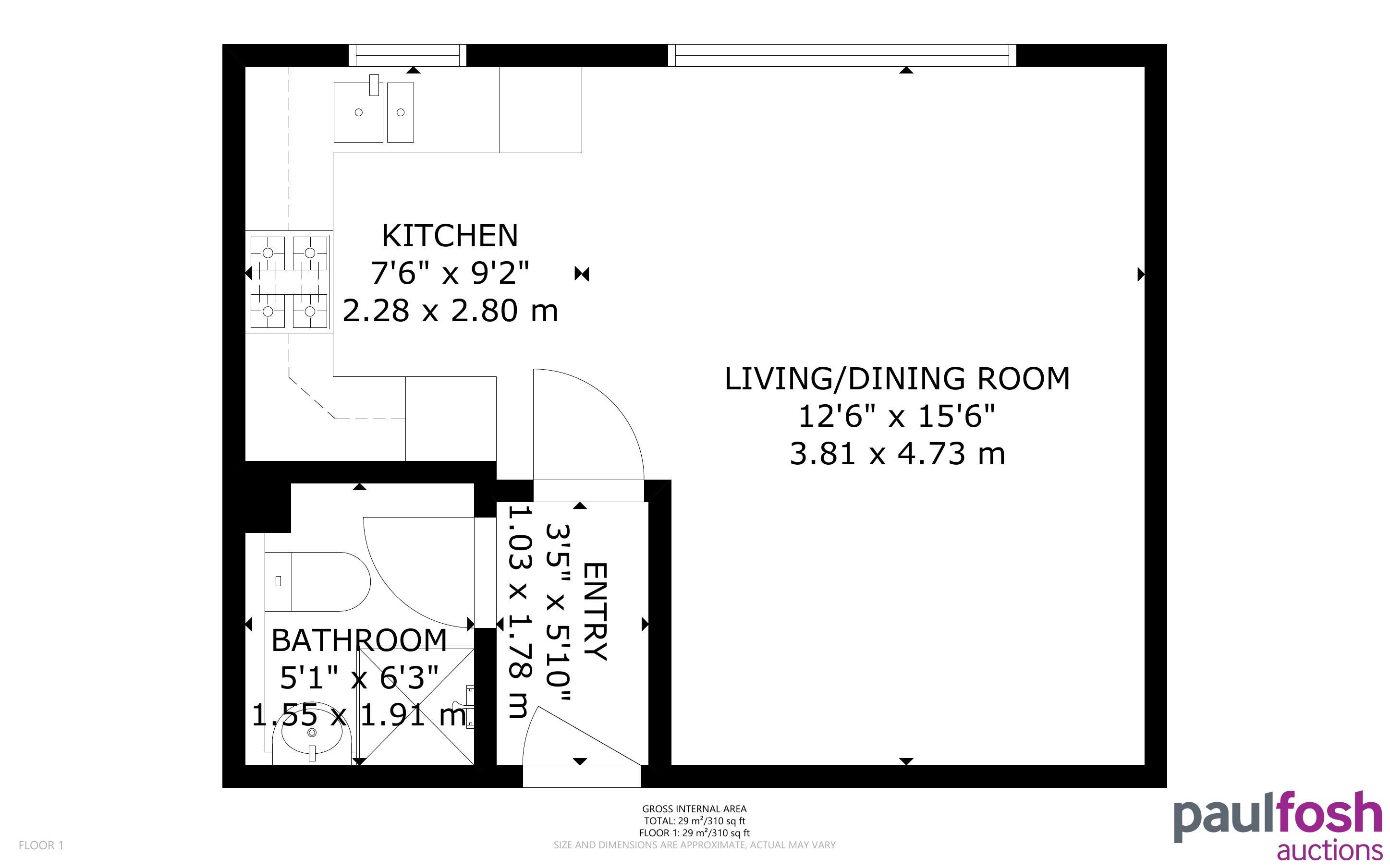 First Floor: Open plan lounge/kitchen/bedroom, shower room