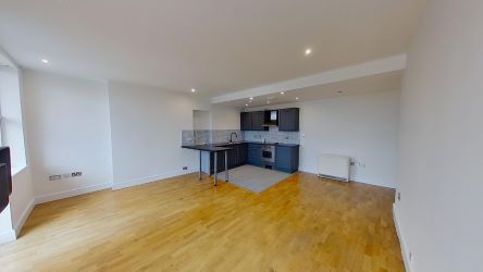 Top floor apartment: Hallway and staircase, open plan lounge/kitchen/dining area, landing, 2 double bedrooms with storage, bathroom & airing cupboard