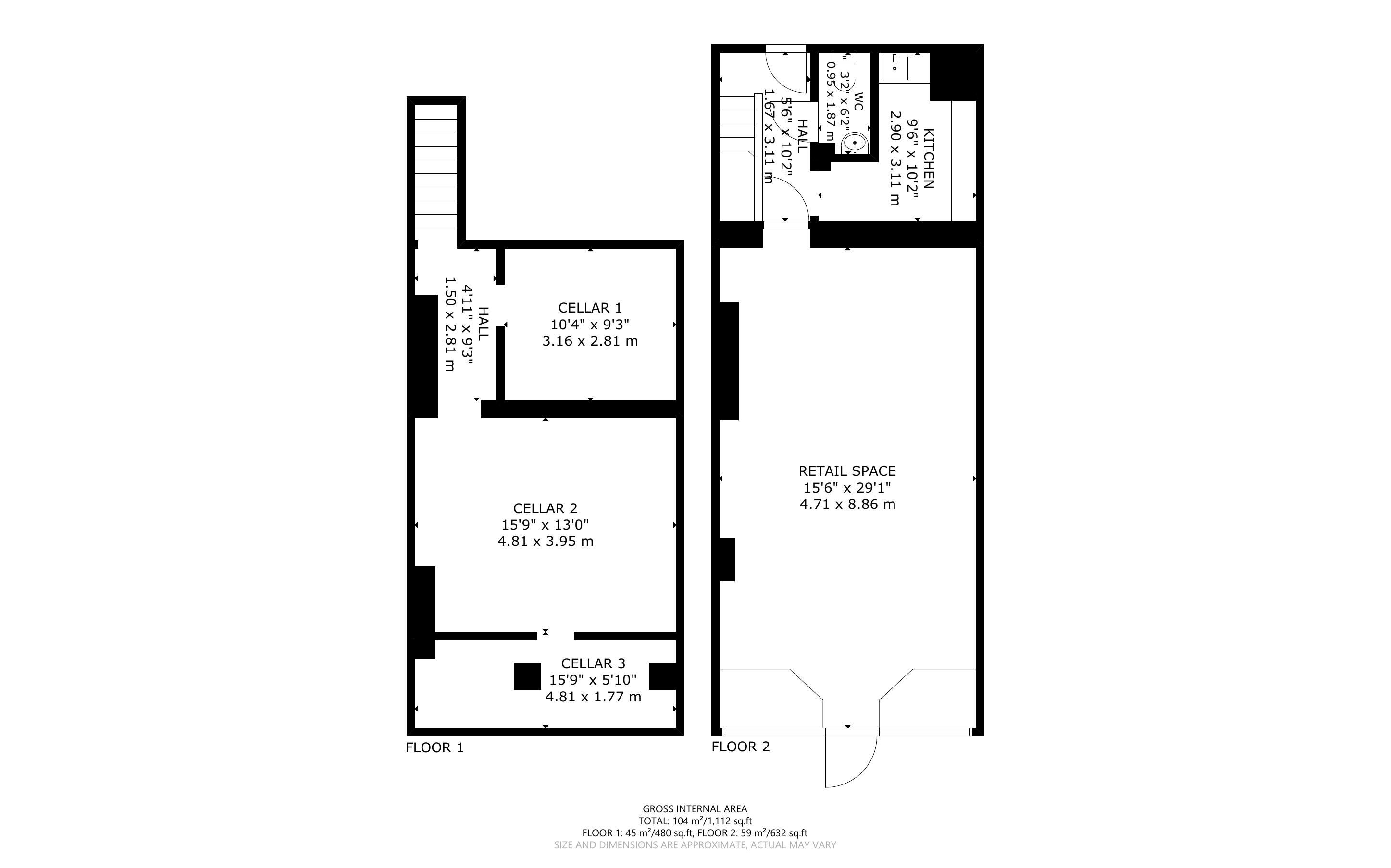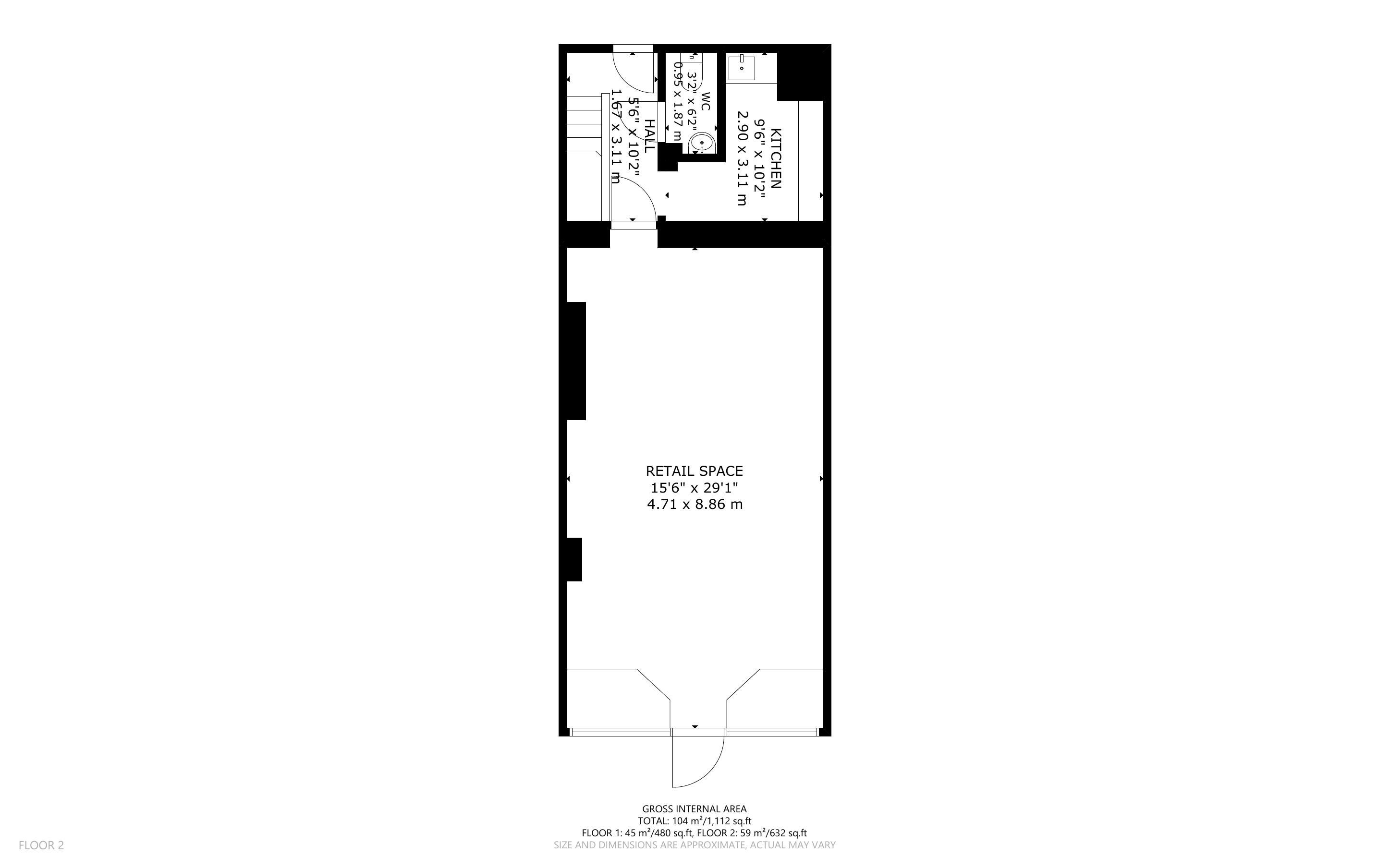 | Ground (Shop) | Shop (4.4 x 9.14), rear hall, kitchen (6.7 x 6.3), WC | |
