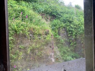 Outside: Rear steeply sloping garden (overgrown), front garden (overgrown) with under steps storage area