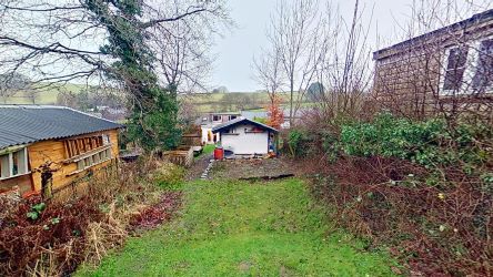 Outside: A long rear garden with storage shed and decking area to enjoy sunny days