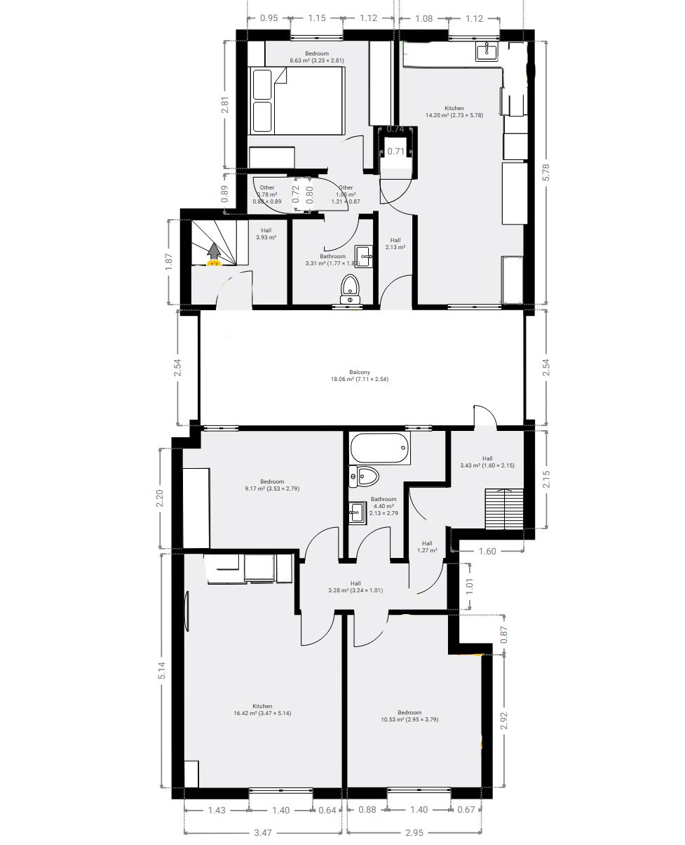 The first floor comprises three recently refurbished residential flats: two one-bedroom and one two-bedroom. Each flat includes a kitchen, dining area, bathroom, and master bedroom, all finished to a high standard.