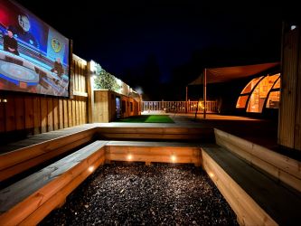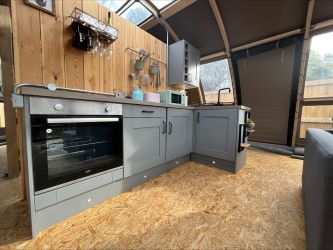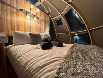 Accommodating maximum of 4 guests with 1 double bed and 1 sofa bed, a private shower room, and a fully fitted kitchen. Enclosed outdoor decking area with outdoor furniture and sunken seating area with projector screen and swing. Also comes with an ice barrel. This is glamping taken to another level.