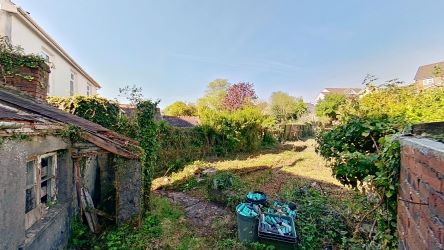Outside: Spacious rear garden with outbuilding and side access to property