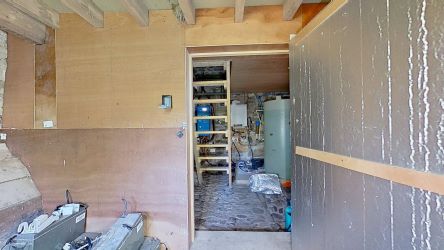 The Water is collected from a spring up on common land above the property to the South East. This catchment feeds a fenced-in tank about 150 metres above the house. A modern sealed water tank has recently been installed and a new pipe laid from the tank on the hill to the house. Water can be pumped through as needed into a large 1000L storage tank in the plant room in the barn. The water goes through a filter prior to entering this tank to remove particles. Water is then pumped through to the house when a tap is turned on and there is an additional Ultraviolet water filter installed to treat the water in line with water authority requirements. Hot water is heated via the thermal store.