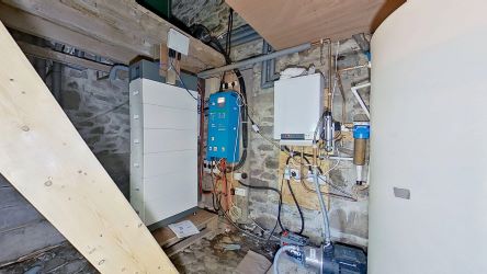 The professionally installed electrical system for the house is fed by a large 5.4kW (18 x 300W) solar array mounted on the rear roof of the barn. These solar panels feed into a Victron solar charger and inverter which charges a newly installed BYD Premium LV battery stack, providing the house with sufficient power for modern domestic living. Victron and BYD equipment is excellent quality and the whole system has been very reliable. In order to ensure that there is always a reliable supply of electricity there is also a large Hyundai diesel generator installed which can be auto started by the Victron equipment if the batteries get low (e.g. if there is snow blocking the panels).