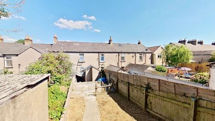 Outside Rear terraced garden with rear lane access and two storage buildings