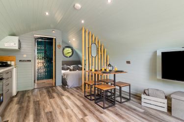 Set in a beautiful holiday site of Redberth Gardens, Tenby, Pembrokeshire, a very popular open plan Glamping Pod.