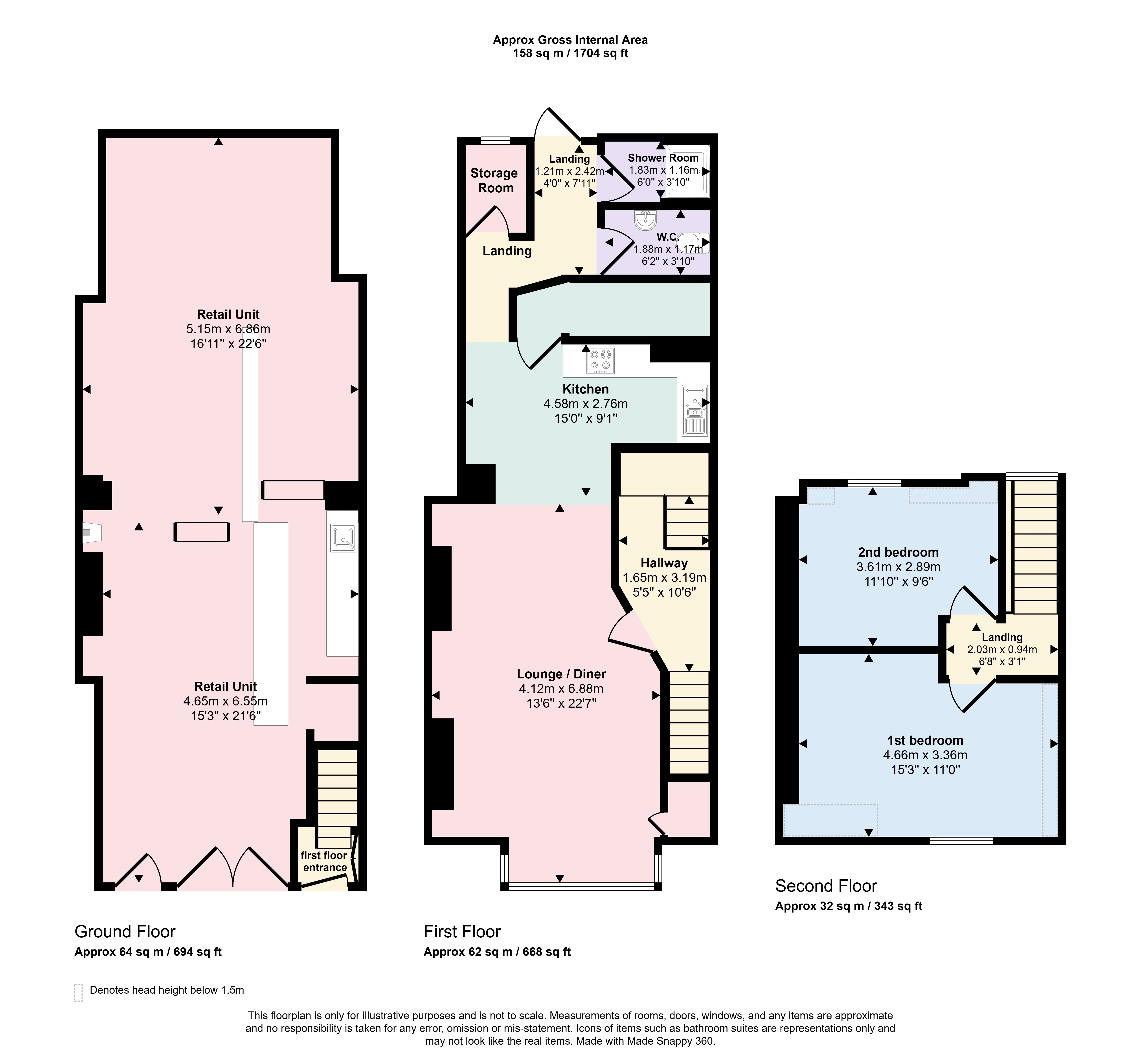 First Floor: Lounge area, kitchen, bathroom, and additional storage space