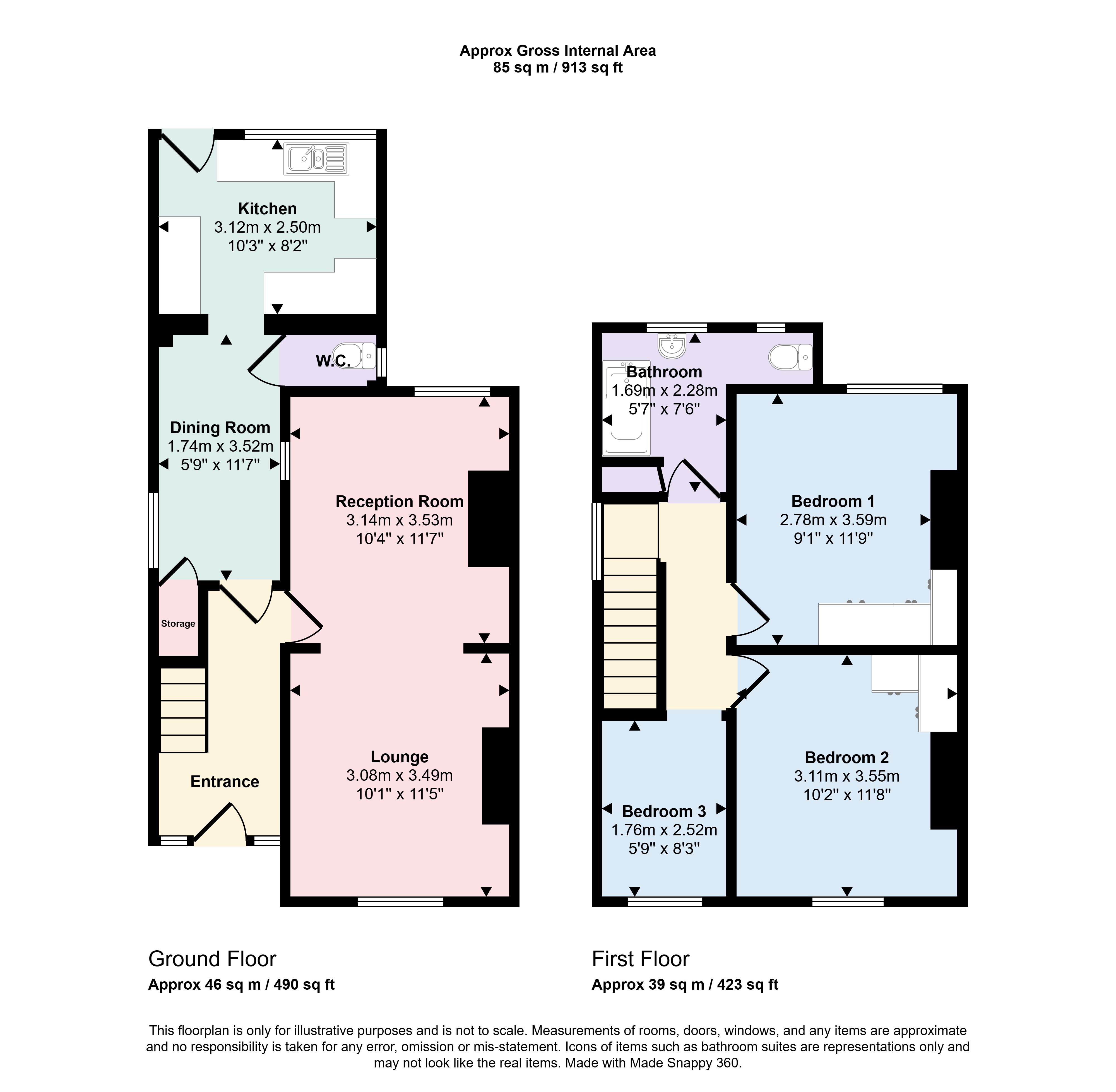 First Floor: Three bedrooms, bathroom