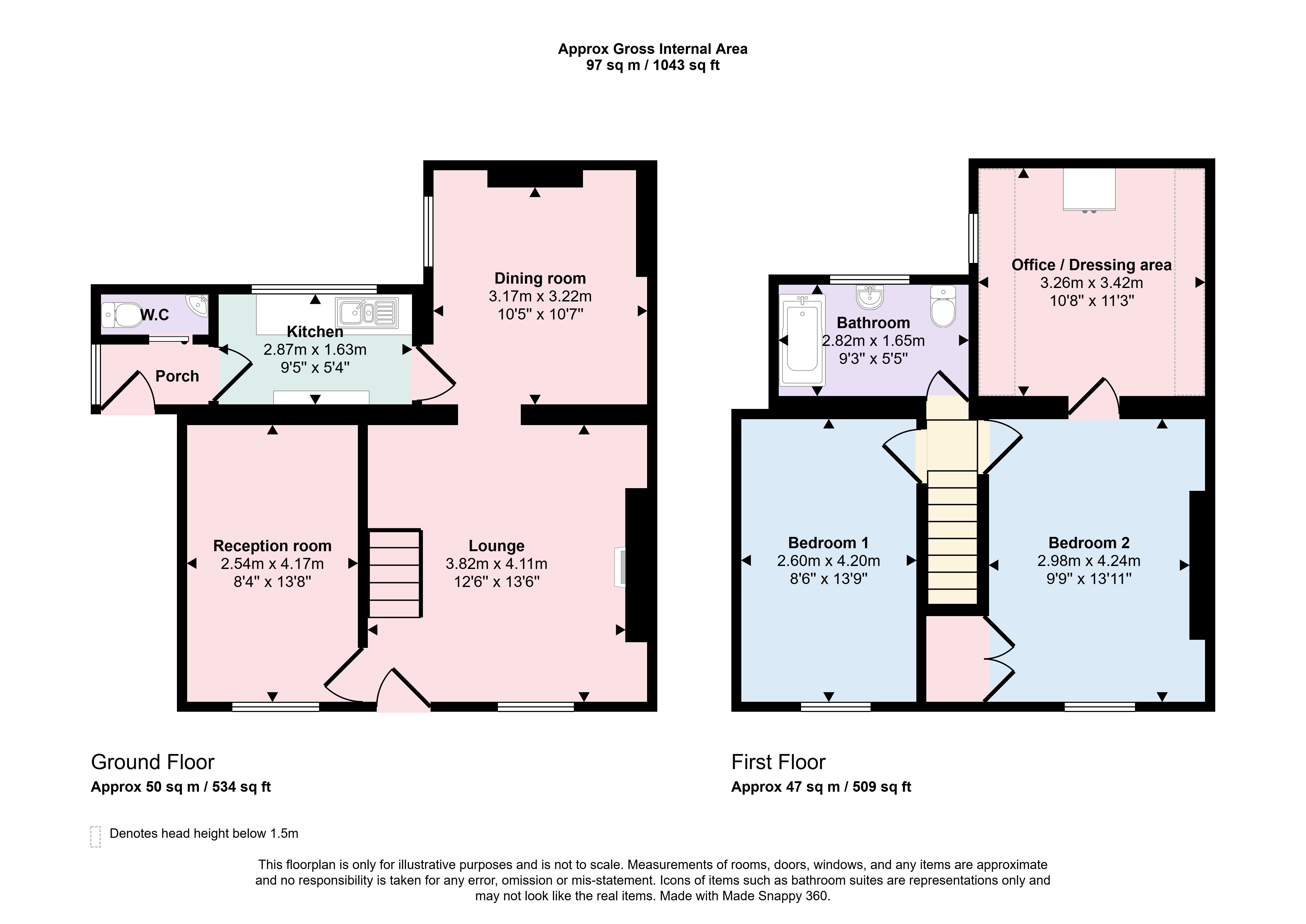 First Floor: 2 bedrooms, office/study/dressing room, bathroom