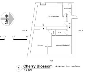 The building has one large kitchen area, open plan living/dining room, bathroom and storage area. It also has outdoor space.