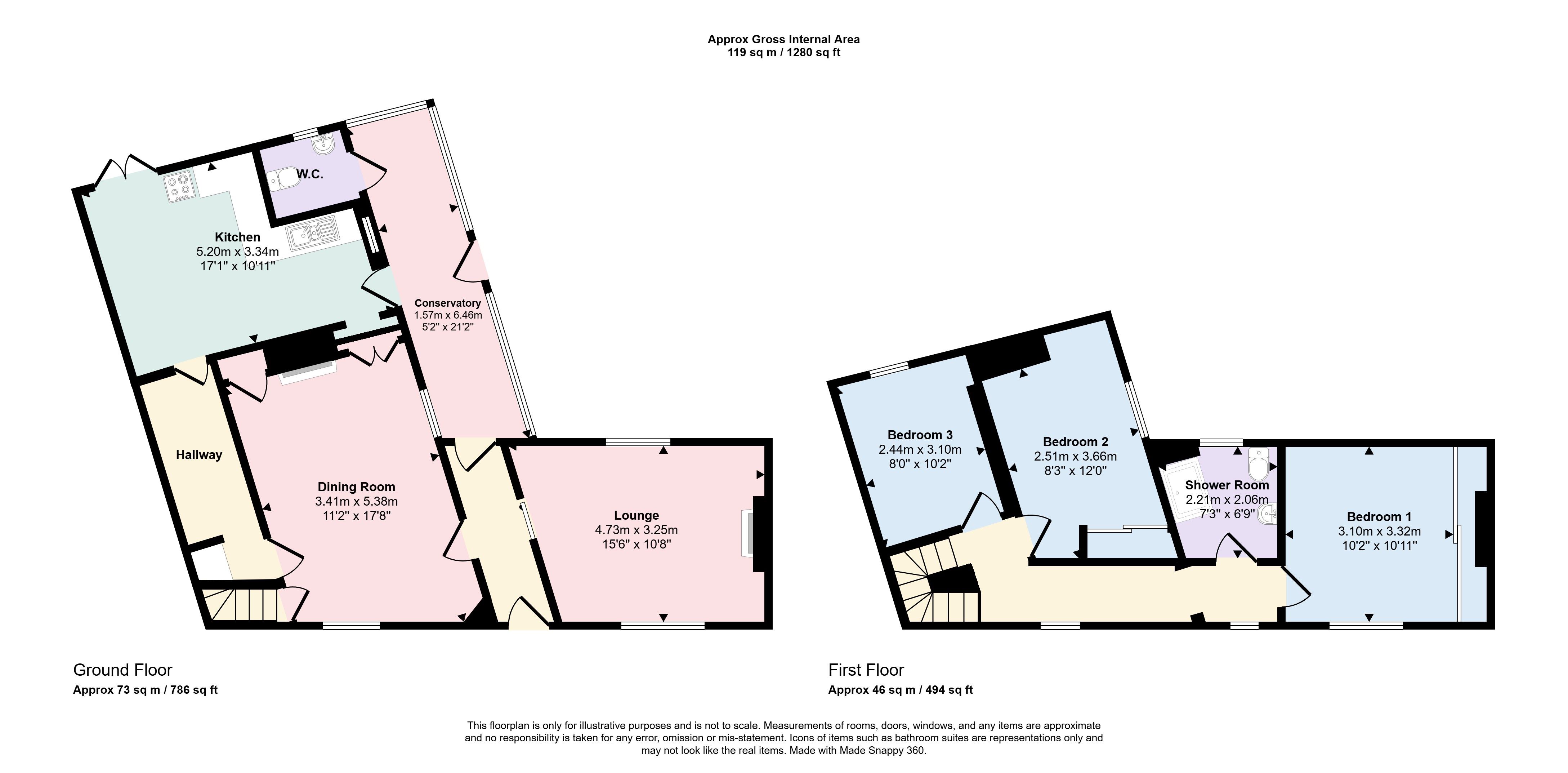 First Floor: Three bedrooms, shower room