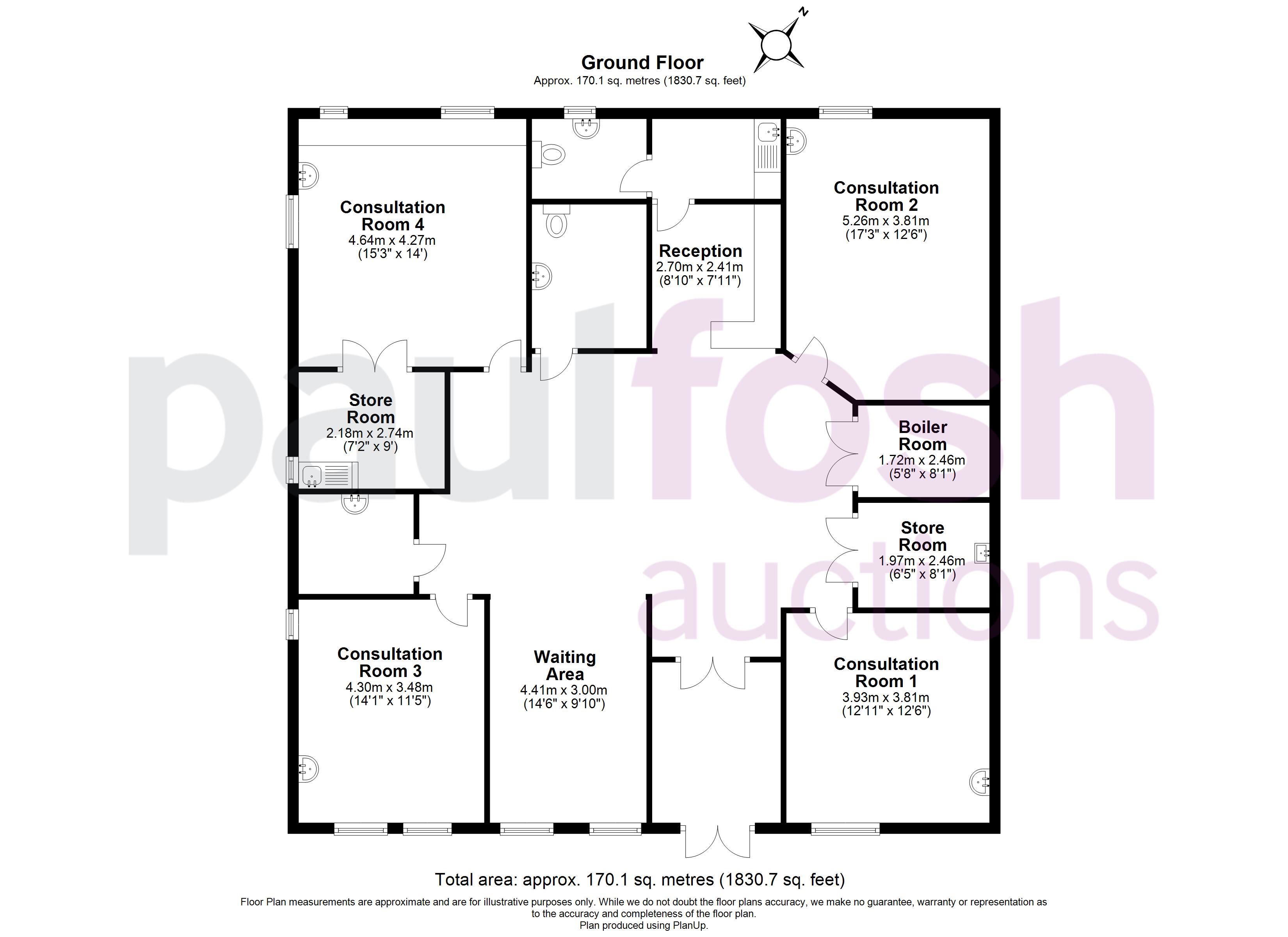 Ground Floor: Entrance, reception/waiting area, 4 consultation rooms, baby changing room, disabled wc, boiler room, kitchen, wc
