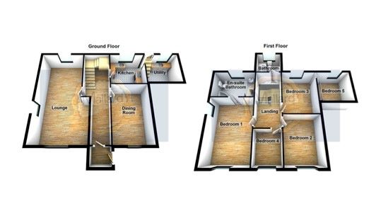 First Floor: Landing, 5 bedrooms (master with en-suite), bathroom