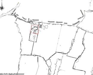 Ground Floor: Single story buildings (377 sq. ft.) around large walled yard leading out to paddock via gate. views