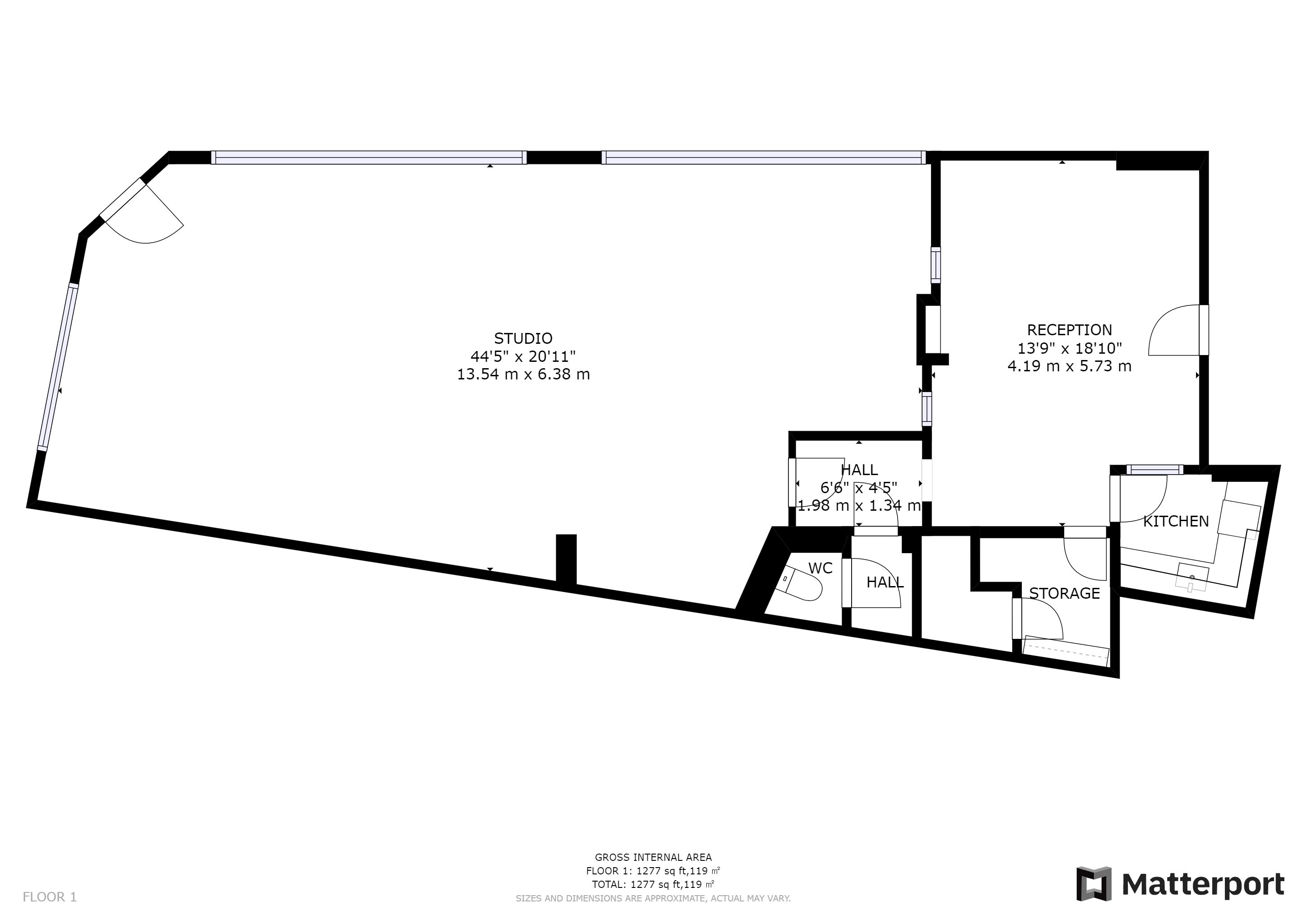 Ground Floor: Communal entrance lobby, Dance studio containing reception/parents lounge, kitchen, dance studio, storage areas and wc.