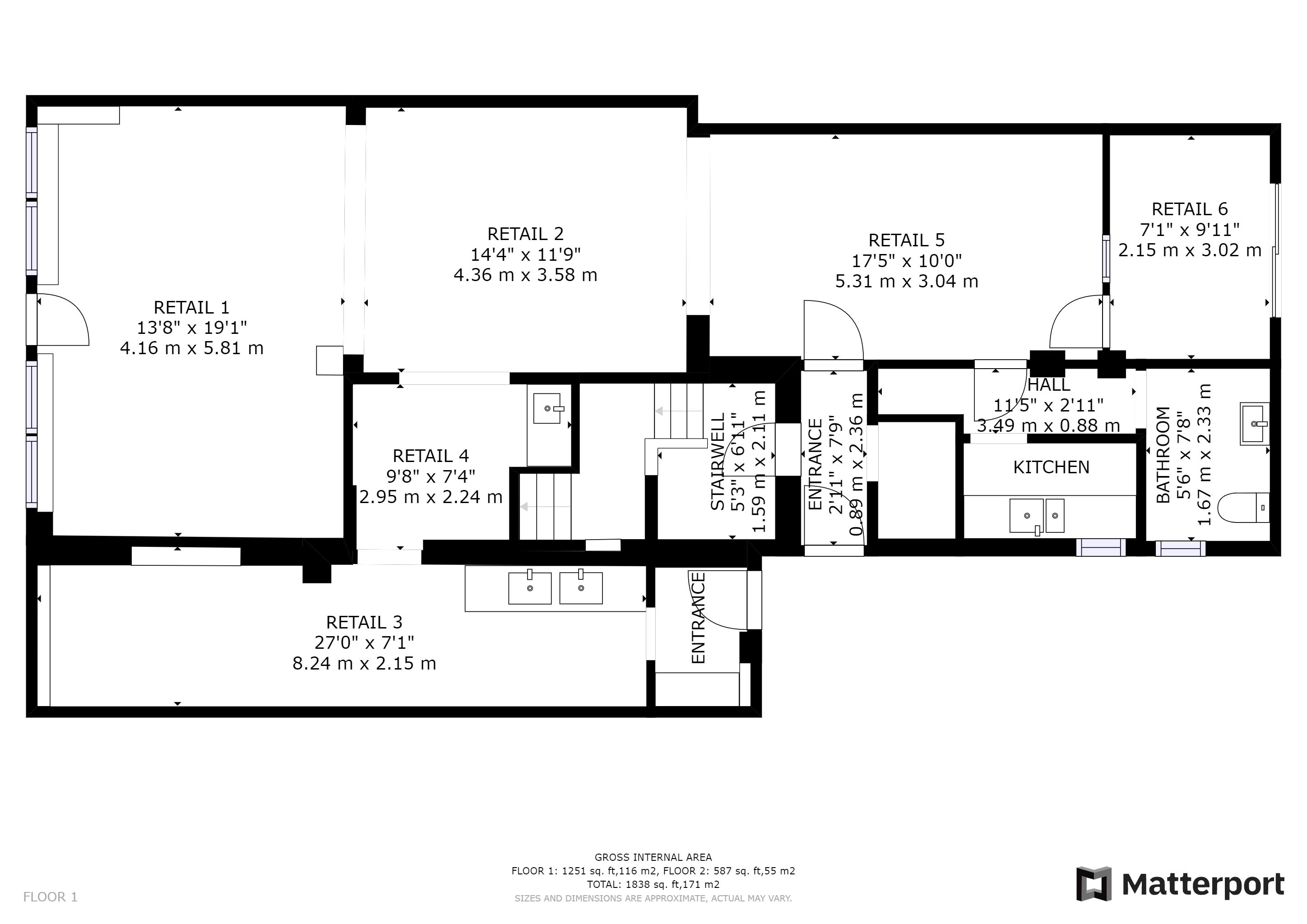 Ground Floor - Commercial Unit: Main shop/retail area, kitchen, ancillary space, room, kitchenette, wc