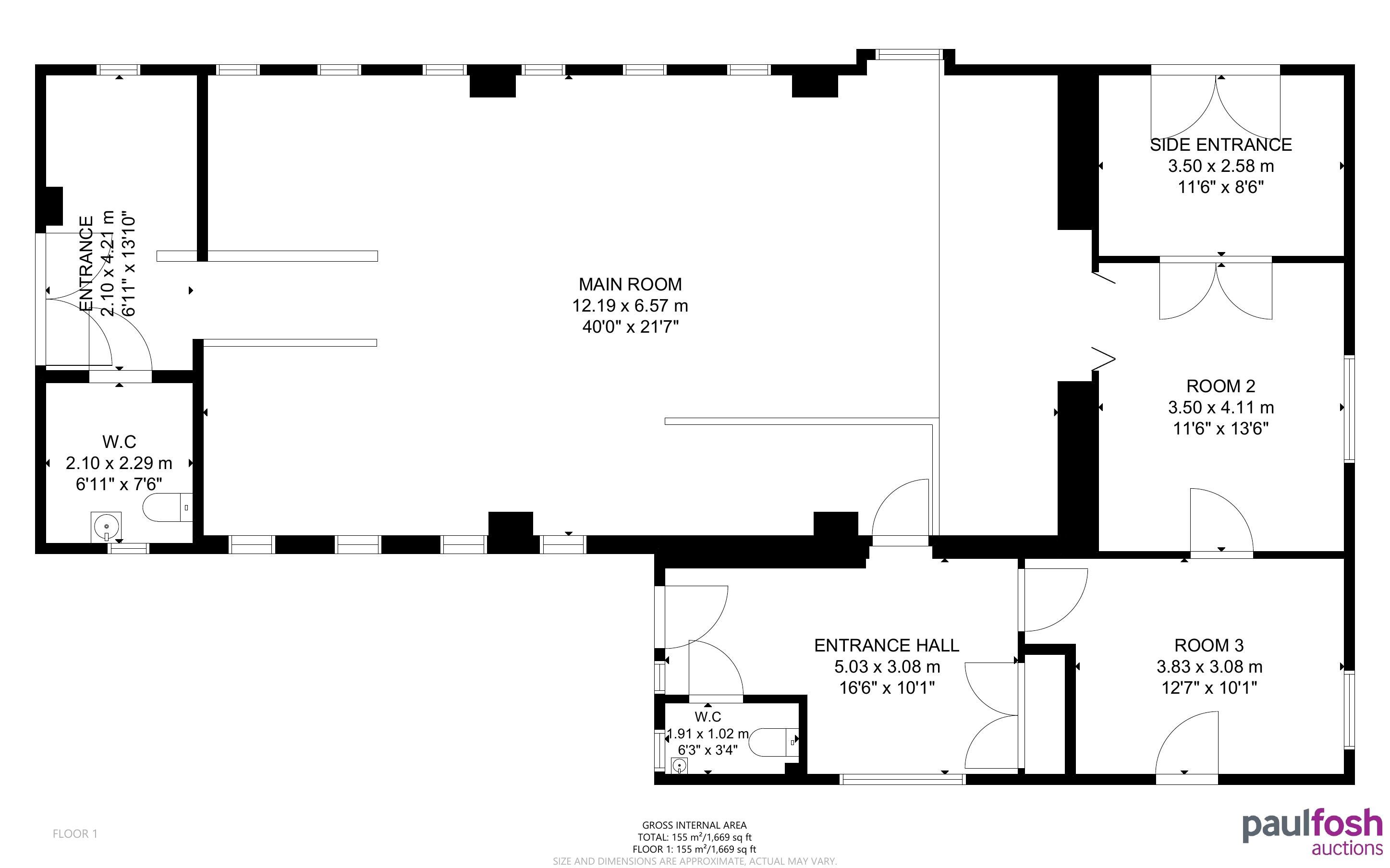Located at the front of the property are two entrances, one of which has double doors. Inside is comprised of two foyers, two rooms, a kitchenette and a disabled WC.