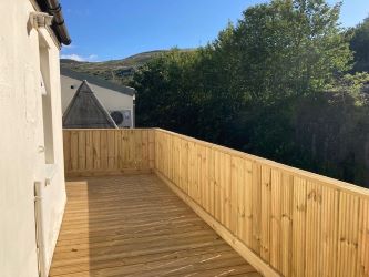 The property benefits from three entrances to the front of the building, one which provides access to the top floor residential accommodation. The other two lead directly into the open plan former bar/restaurant area. Subject to the relevant consent, the ground floor may be divided into two commercial units. There is also a good sized kitchen area, and balcony to the rear which provides scenic views.