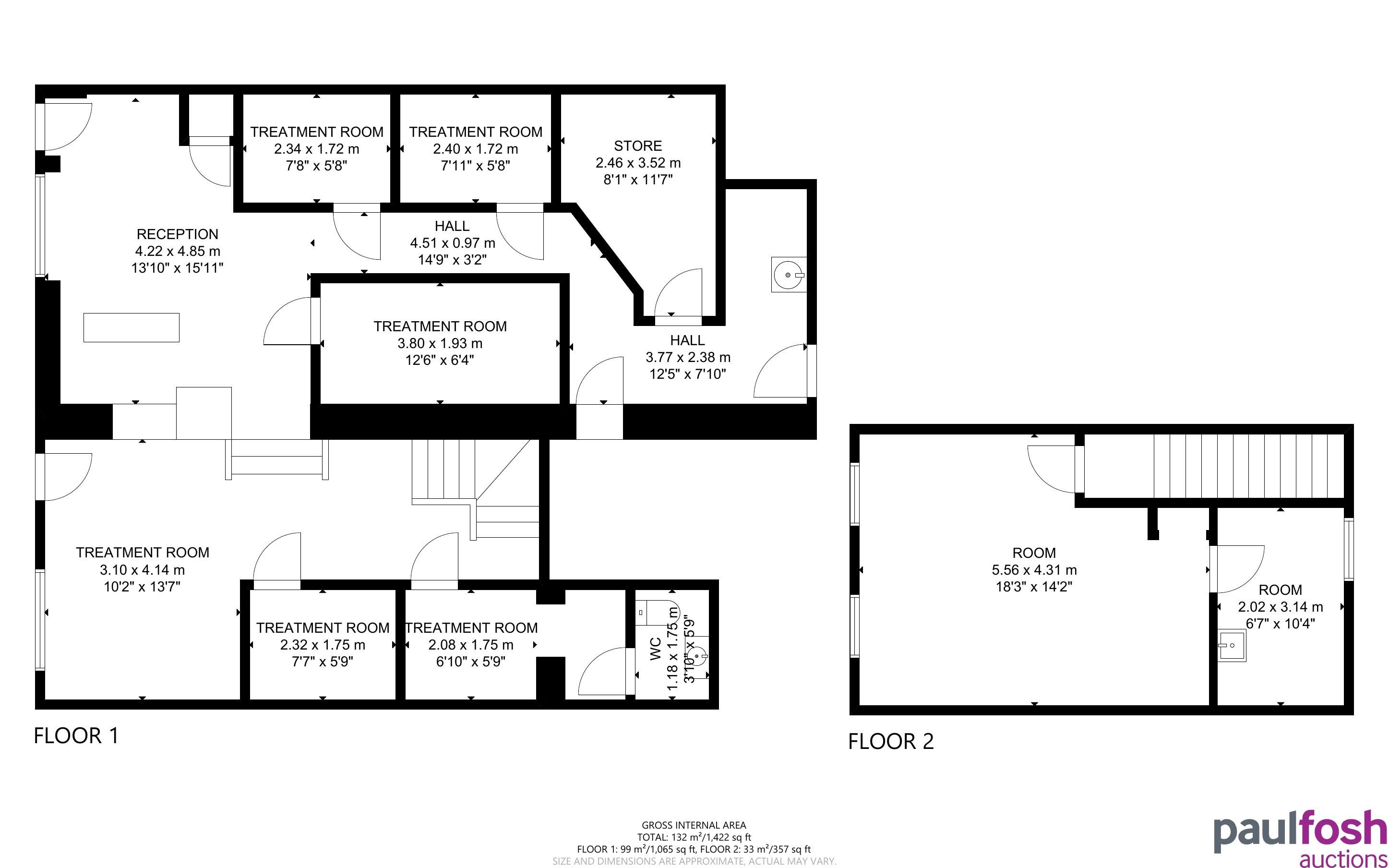Ground Floor: Reception area, 4 tanning units and 2 treatment rooms, WC, hallway with stairs to first floor, 2 rooms