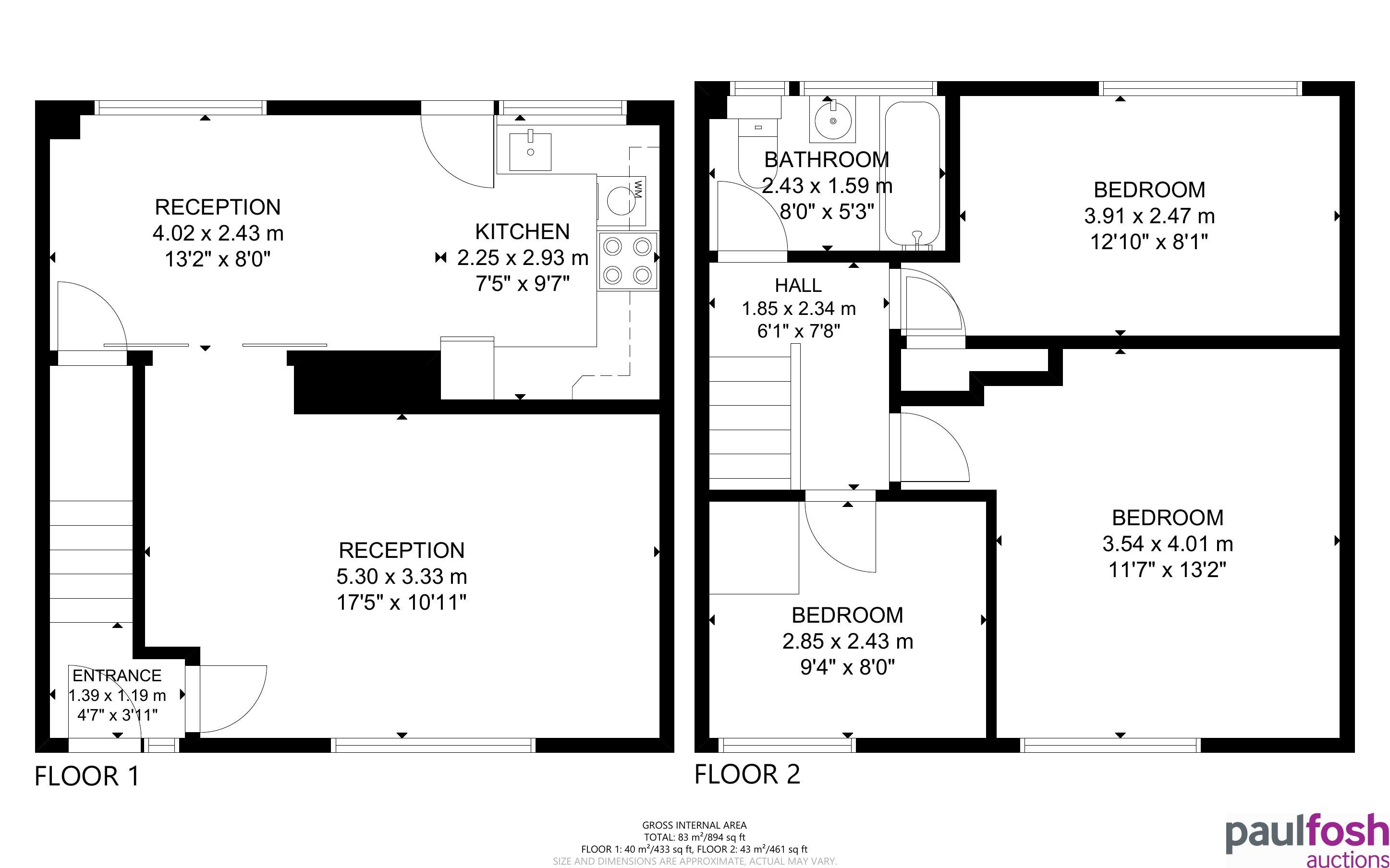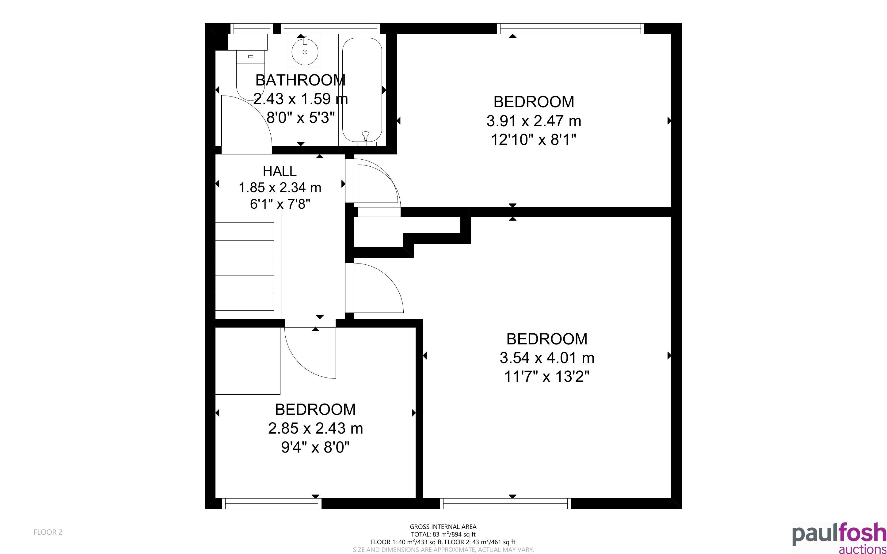 First Floor: Landing, 3 bedrooms, bathroom and attic space