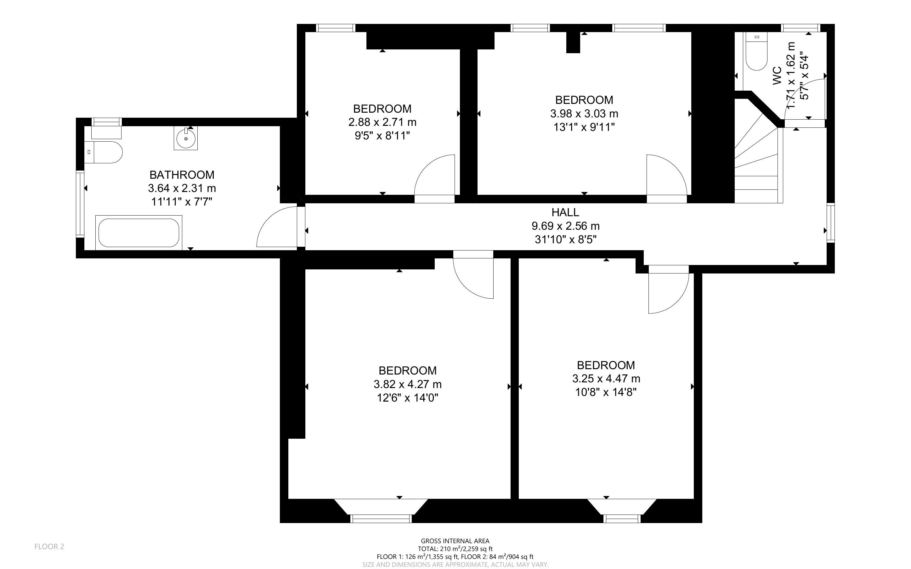 First Floor: 4 bedrooms, bathroom, WC